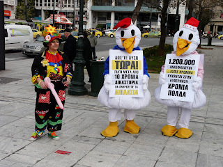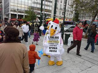 Ευφάνταστες γιορτινές διαμαρτυρίες διοργάνωσε σήμερα το μεσημέρι ο Σύλλογος Ζημιωθέντων της Ασπίς Πρόνοια σε Αθήνα και Θεσσαλονίκη. Στην πλατεία Συντάγματος, στην Ερμού και στο Κολωνάκι ένας κλόουν και δύο παπιά έφτιαξαν και μοίρασαν χιλιάδες μπαλόνια και έπαιξαν με τα παιδιά.