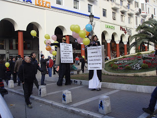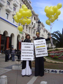 Την ίδια ώρα, ξυλοπόδαροι έκαναν την εμφάνισή τους στην πλατεία Αριστοτέλους και στην οδό Τσιμισκή στη Θεσσαλονίκη φορώντας πικέτες και μοιράζοντας μπαλόνια με το λογότυπο του Συλλόγου Ζημιωθέντων της Ασπίς.